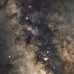 さそり座の毒針のあたりで、写野中心での南中高度が15°ほどとかなり低いあたり。2023/6/16に撮った彼岸花星雲と出目金星雲のセットが上寄りにいる。右寄りにいるのはIC4628、通称「えび星雲」らしいが、いつも通りよく分からない。